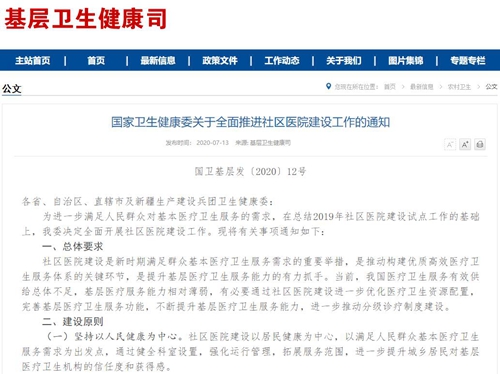 人民網北京7月13日電(董童)13日,據國家衛(wèi)生健康委官網消息,為進一步滿足人民群眾對基本醫(yī)療衛(wèi)生服務的需求,在全面總結2019年試點工作的基礎上,按照2020年全國衛(wèi)生健康工作會議精神,國家衛(wèi)生健康委經研究制定了《關于全面推進社區(qū)醫(yī)院建設工作的通知》(以下簡稱“通知”)。