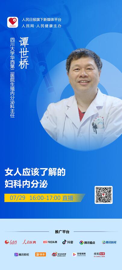 2020年07月29日(周三)16:00-17:00,“人民好醫(yī)生”客戶端將邀請(qǐng)四川大學(xué)華西第二醫(yī)院生殖內(nèi)分泌科主任譚世橋教授進(jìn)行視頻直播,為大家在線科普什么是婦科內(nèi)分泌,讓大眾了解婦泌疾病,千萬(wàn)不要錯(cuò)過(guò)。