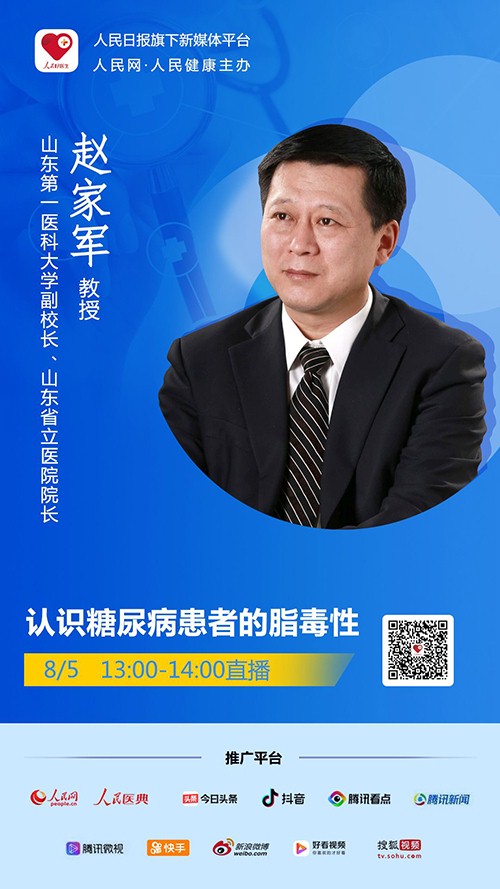 2020年08月05日(周三)13:00-14:00,“人民好醫(yī)生”客戶端將邀請山東第一醫(yī)科大學(xué)副校長,山東省立醫(yī)院院長趙家軍教授進行視頻直播,為大家在線科普什么是糖尿病患者的脂毒性,千萬不要錯過。