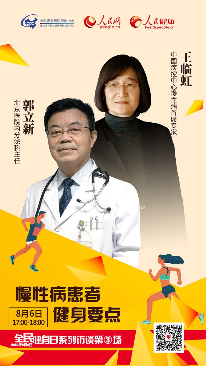 2020年08月06日(周四)17:00-18:00,“人民好醫(yī)生”客戶端將邀請中國疾控中心慢病中心首席專家王臨虹教授和北京醫(yī)院內分泌科主任郭立新教授進行視頻直播,為大家在線科普慢性病患者健身要點,千萬不要錯過。