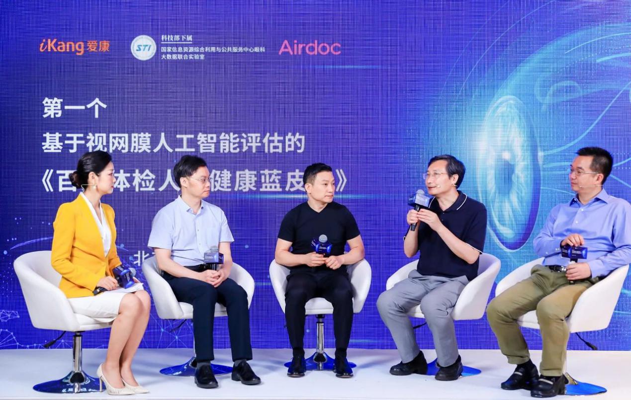 圓桌論壇(從右至左):Airdoc首席醫(yī)學官陳羽中,首都醫(yī)科大學附屬北京同仁醫(yī)院副院長魏文斌,愛康集團創(chuàng)始人、董事長兼CEO 張黎剛,國家科技信息資源綜合利用與公共服務中心眼科大數(shù)據(jù)聯(lián)合實驗室主任胡紅亮,主持人劉曦