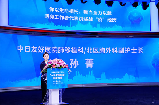 在大會“一線講述”環(huán)節(jié),全國抗擊新冠肺炎疫情先進個人、中日友好醫(yī)院肺移植科副護士長孫菁講述了她的“戰(zhàn)疫”故事。