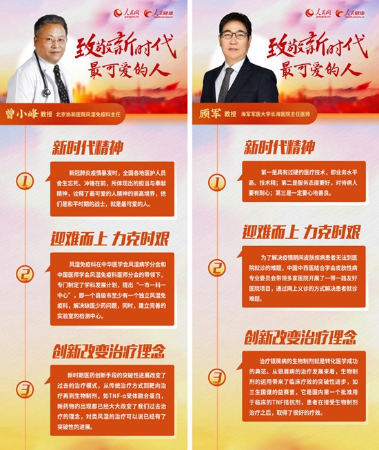 人民網(wǎng)北京8月19日電 在新冠肺炎疫情防控中,廣大醫(yī)務(wù)工作者白衣執(zhí)甲、逆行出征,為全國疫情防控工作取得重大戰(zhàn)略成果做出了突出貢獻(xiàn)。在第三個中國醫(yī)師節(jié)日即將到來之際,人民網(wǎng)就弘揚抗疫精神、護(hù)佑人民健康等話題,采訪到北京協(xié)和醫(yī)院風(fēng)濕免疫科主任曾小峰和海軍軍醫(yī)大學(xué)長海醫(yī)院主任醫(yī)師顧軍,兩位醫(yī)生以親身經(jīng)歷與專業(yè)涵養(yǎng)詮釋了何謂“新時代最可愛的人”。