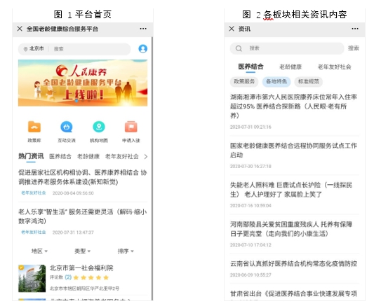 平臺(tái)為廣大老年人群及其家屬提供權(quán)威可信的信息及服務(wù),主要包含國(guó)家老年政策措施、健康科普知識(shí)、全國(guó)各地經(jīng)驗(yàn)以及醫(yī)養(yǎng)結(jié)合機(jī)構(gòu)信息服務(wù)等。平臺(tái)目前建有醫(yī)養(yǎng)結(jié)合、老齡健康和老年友好社會(huì)三大板塊。