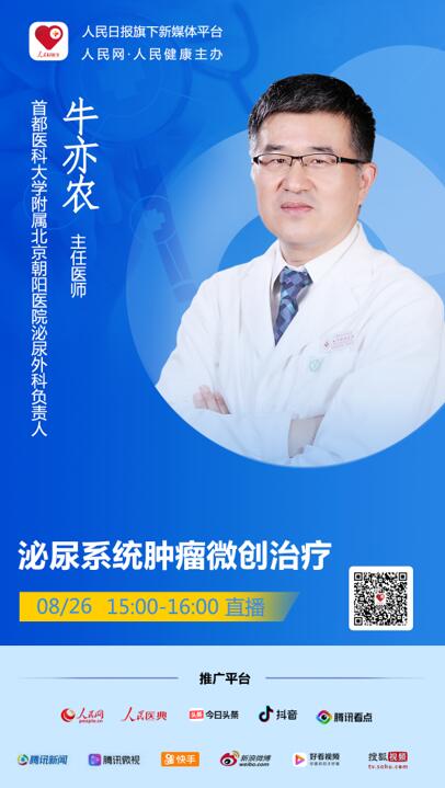 8月26日15:00-16:00,人民日報社旗下新媒體“人民好醫(yī)生”客戶端將邀請首都醫(yī)科大學附屬北京朝陽醫(yī)院泌尿外科負責人、主任醫(yī)師牛亦農(nóng)做客直播間,和大家分享泌尿系統(tǒng)腫瘤的微創(chuàng)治療,歡迎大家觀看。