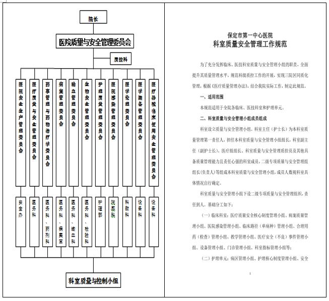 從院級層面,該醫(yī)院制定了《科室質(zhì)量安全管理工作規(guī)范》,科室成立了醫(yī)療質(zhì)量管理工作小組,組長由科室主要負責人擔任,指定專人負責日常具體工作。并制定了《科室質(zhì)量與安全管理小組管理辦法》,明確了科室質(zhì)量與安全管理小組工作職責,制定了科室質(zhì)量與安全管理小組活動內(nèi)容及要求。