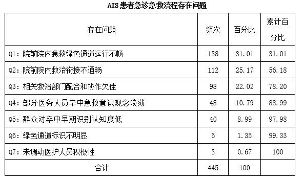 急診科腦卒中質(zhì)量控制小組收集AIS患者急診急救流程存在問題,統(tǒng)計(jì)數(shù)據(jù),并進(jìn)行柏拉圖分析。