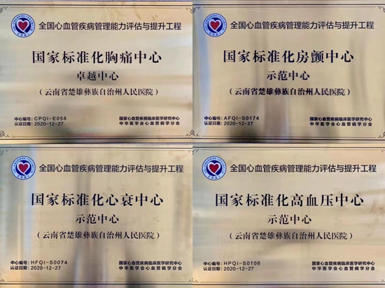 近日,楚雄州人民醫(yī)院榮獲中國(guó)心血管健康聯(lián)盟頒發(fā)的“心臟健康關(guān)愛(ài)先鋒單位”獎(jiǎng)和全國(guó)心血管疾病管理能力評(píng)估與提升工程“國(guó)家級(jí)標(biāo)準(zhǔn)化胸痛中心(卓越中心)”、“國(guó)家級(jí)標(biāo)準(zhǔn)化房顫中心(示范中心)、“國(guó)家級(jí)標(biāo)準(zhǔn)化心衰中心(示范中心)“、國(guó)家級(jí)標(biāo)準(zhǔn)化高血壓中心(示范中心)”稱(chēng)號(hào),標(biāo)志著楚雄州人民醫(yī)院心血管疾病管理胸痛、高血壓、房顫、心衰“四大中心”建設(shè)已達(dá)國(guó)家先進(jìn)標(biāo)準(zhǔn),心血管疾病管理建設(shè)工作走上了標(biāo)準(zhǔn)化發(fā)展之路。