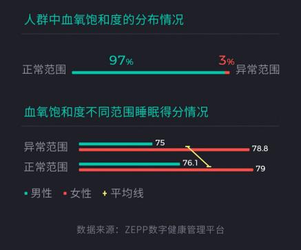 血氧飽和度(SaO2)即血液中血氧的濃度,是人體呼吸循環(huán)的重要生理參數(shù),血氧飽和度的正常范圍是90-100%。血氧飽和度低會(huì)引起缺氧癥狀的表現(xiàn),比如出現(xiàn)氣促、乏力以及胸悶、頭暈,嚴(yán)重的引起呼吸困難現(xiàn)象,出現(xiàn)心力衰竭癥狀。Zepp健康管理平臺(tái)血氧功能監(jiān)測(cè)到,雖然絕大部分人這個(gè)指標(biāo)在正常范圍內(nèi),但仍有3%的人血氧飽和度低于正常血氧范圍。同時(shí),通過血氧飽和度與人群睡眠得分的分析,可以看出血氧飽和度異常人群的平均睡眠得分,也要低于血氧正常范圍人群。