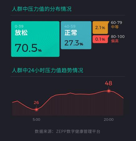 分析Zepp健康管理平臺(tái)中開啟全天壓力監(jiān)測(cè)的人群中,97.8%的人日均壓力值都在正常范圍(放松和正常狀態(tài))內(nèi)。在全天24小時(shí)中,大部分人在凌晨5點(diǎn)左右壓力值最低,晚上8點(diǎn)左右壓力值最高。Zepp健康管理平臺(tái)中的壓力指標(biāo)是用來評(píng)定身體狀態(tài)改變的指標(biāo),通常在壓力值偏高時(shí),應(yīng)當(dāng)注意適當(dāng)休息;壓力值在低于60時(shí)為正常和放松狀態(tài),壓力值高于60時(shí)判定為中等和偏高。