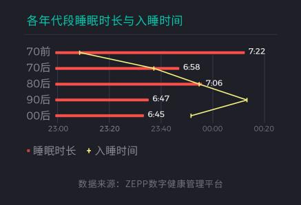 從睡眠習(xí)慣看,70前睡眠習(xí)慣最好,但早睡早起的人群也僅占46%,平均每天睡眠時(shí)間最久,達(dá)到7小時(shí)22分鐘。只有70前和80后群體睡眠時(shí)間超過了7小時(shí),00后群體的睡眠時(shí)間最少,平均每晚只睡了6小時(shí)45分鐘;而90后夜生活豐富,入睡時(shí)間最晚。