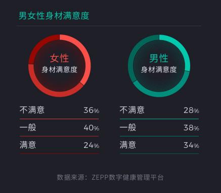 通過調(diào)研數(shù)據(jù)發(fā)現(xiàn),有31%的人對(duì)自己的身材感到不滿意,24%的女性對(duì)自己身材滿意,男性群體中對(duì)自己身材滿意的占34%,男性對(duì)自己目前的身材滿意度高于女性,并且男性比女性每周運(yùn)動(dòng)次數(shù)也更多。