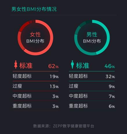 雖然男性對(duì)于自己身材更自信,但是我們通過Zepp健康管理平臺(tái)監(jiān)測(cè)的數(shù)據(jù),看到的卻是女性的身材管理其實(shí)好于男性。數(shù)據(jù)顯示,62%的女性BMI指數(shù)處于標(biāo)準(zhǔn)范圍內(nèi),而男性BMI標(biāo)準(zhǔn)范圍內(nèi)只占46%。男性群體更應(yīng)注重體重管理。尤其是70后男性,標(biāo)準(zhǔn)BMI范圍占比最少,女性中70前與00后女性標(biāo)準(zhǔn)BMI占比相對(duì)較少。