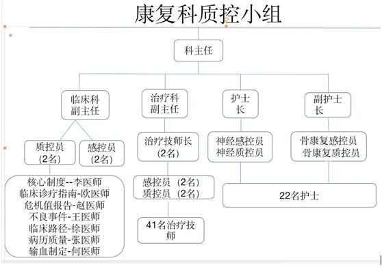 醫(yī)院實(shí)行院質(zhì)量管理部門(mén)、科室三級(jí)管理組織,各級(jí)管理組織職責(zé)明確,醫(yī)院實(shí)行分級(jí)管理,醫(yī)務(wù)部、護(hù)理部、醫(yī)院質(zhì)量控制部等質(zhì)量管理部門(mén)、完成醫(yī)院質(zhì)量與安全質(zhì)量管理的各項(xiàng)方針、政策、制度的執(zhí)行?剖抑魅呜(fù)責(zé)組織落實(shí)質(zhì)量與安全管理及持續(xù)改進(jìn),負(fù)責(zé)科室診療小組分組、診療活動(dòng)管理,制定各級(jí)醫(yī)師崗位職責(zé)和技能要求,對(duì)醫(yī)療小組進(jìn)行動(dòng)態(tài)管理。保證診療組織工作規(guī)范、有效?祻(fù)醫(yī)學(xué)科設(shè)立了科室質(zhì)量與安全管理質(zhì)控小組,人員安排如下: