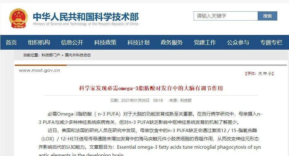 2021年1月6日,科技部官網(wǎng)最新發(fā)布的題為《科學家發(fā)現(xiàn)必需omega-3脂肪酸對發(fā)育中的大腦有調節(jié)作用》指出,必需Omega-3脂肪酸( n-3 PUFA)對于大腦的功能發(fā)育成熟至關重要。在流行病學研究中,母親攝入n-3 PUFA與減少多種神經(jīng)系統(tǒng)疾病有關,但對n-3 PUFA缺乏影響中樞神經(jīng)系統(tǒng)發(fā)育的機制了解甚少。