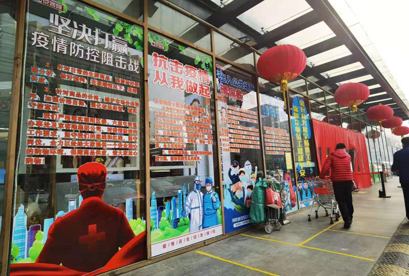 北京市朝陽區(qū)京客隆超市(甜水園店)的玻璃大門上,貼滿了“堅(jiān)決打贏疫情防控阻擊戰(zhàn)”“抗擊疫情從我做起”“進(jìn)入公共場所請(qǐng)佩戴口罩”等醒目標(biāo)語及五彩繽紛的宣傳圖片,與玻璃門上方充滿節(jié)日喜慶的大紅燈籠相映成趣。超市嚴(yán)格按照防范規(guī)定,消費(fèi)者需要先掃描健康碼、測量體溫后,再有序進(jìn)入超市。