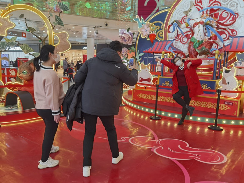 春節(jié)期間,在位于北京市朝陽區(qū)雙井街道的某商場內(nèi),一家三口佩戴口罩悠閑游逛。在商場中心位置的特色展臺(tái)前,阿姨擺出跳舞的姿勢(shì),難掩口罩下綻放的笑顏,家人趕忙用手機(jī)記錄下她的美好心情。