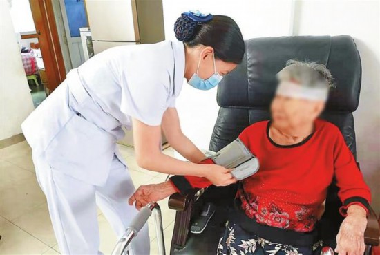 ▲醫(yī)護人員為患者提供家庭病床服務。