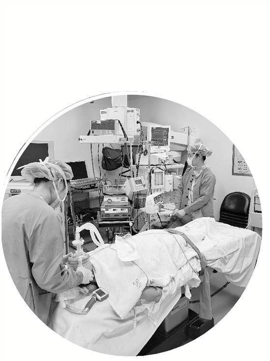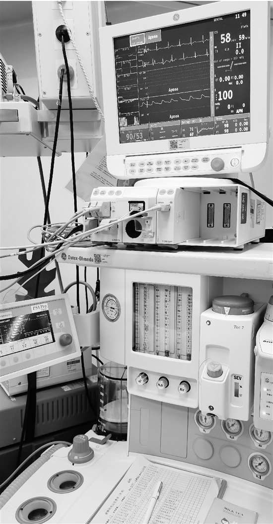 實施麻醉為什么需要這么多裝備?“因為麻醉會抑制呼吸,讓人缺氧。我們在麻醉的同時會給患者吸氧,多數(shù)全麻,還需要給患者氣管插管,人工呼吸,就是為了避免意外。麻醉會讓人嘔吐,失去意識后,嘔吐可能會堵塞氣道!敝艽蟠赫f,“如果沒有這些設(shè)備,我也不敢給人實施麻醉!