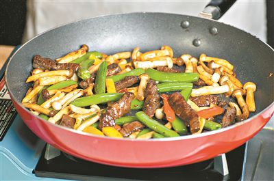 5.洗鑊后煎蟹味菇,煎至蟹味菇金黃色時,加少許鹽,后放入牛肉,再加燒汁撈一撈;