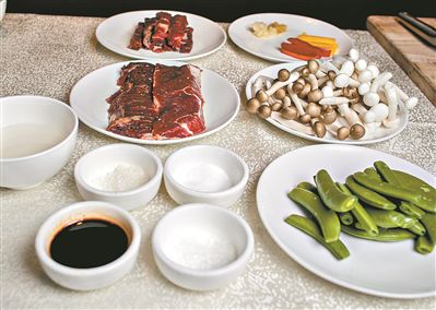 1.將甜蜜豆去掉頭和尾,蟹味菇去尾,牛肉按逆紋路切條,牛肉切成大約5厘米長,厚度0.8毫米;