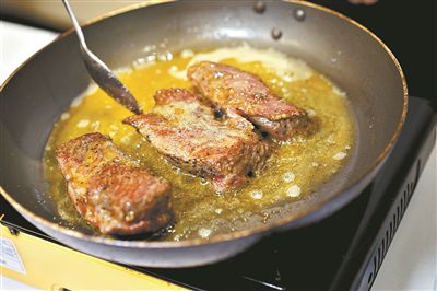 Tips:如果給孩子吃,最好煎至九成熟甚至全熟。煎的時候,先大火煎,鎖住牛扒外面,防止肉汁流失,再用中火繼續(xù)煎。