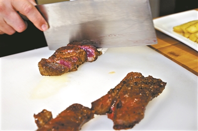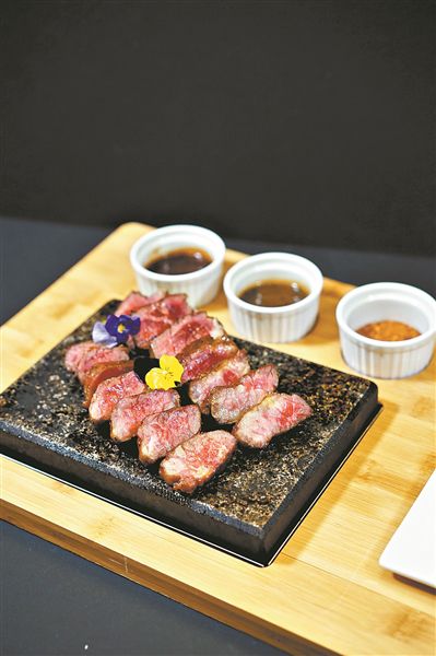 4.準(zhǔn)備一塊燒熱的石板,將牛肉厚片放于其上,配上黑椒汁、黑松露汁和牛排調(diào)料即可(圖⑥)。
