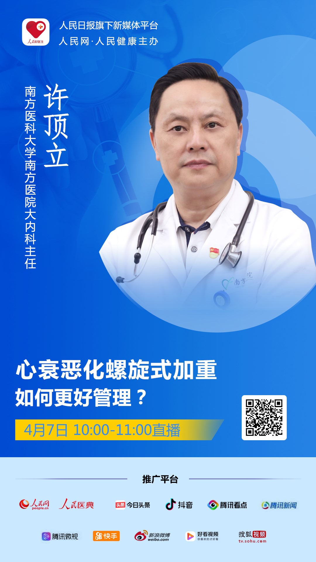 2021年4月7日(周三)10:00-11:00,南方醫(yī)科大學(xué)南方醫(yī)院大內(nèi)科主任許頂立做客人民日?qǐng)?bào)社旗下新媒體“人民好醫(yī)生”客戶端,為大眾答疑解惑。
