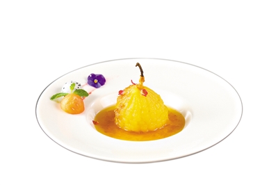 朱雪敏稱,荼薇可以做成凍干露、氣泡水、做成醬、酒等等。相比起普通的玫瑰花,它的香氣是濃郁張揚而奔放,能一把將人的嗅覺抓住,令人難忘。粵菜師傅馬如鑒用這荼薇烹制了一道山楂荼薇雪梨和一道荼薇酒火焰羅氏蝦。前者,是用荼薇花醬和荼薇花酒調(diào)和成冷湯底,將雪梨浸泡其中,待幾日之后,風味滲透入雪梨內(nèi),方可作為一道山楂荼薇雪梨甜品;后者,通過明火炙烤將特有的清新飄逸的荼薇花芬芳與醬汁濃郁的羅氏蝦融合在一起,達到鮮香美味的口感,色香味俱全。