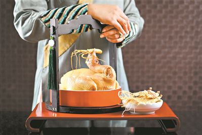 馬師傅用小小人參烹制多道佳肴:水晶雞、燉湯、人參菠菜餃……人參水晶雞是甄選肉質(zhì)鮮美的清遠雞及長白山5年干人參,采用廣式傳統(tǒng)清蒸手法,使得人參的獨特香氣完全地滲入腌制過的肉質(zhì)中,皮爽肉滑鮮味濃,保留了雞肉原汁原味、外皮彈的特點。人參菠菜餃以瘦豬肉為主料,豬肉有滋陰潤燥、益氣生津的功效,搭配富含鐵元素的菠菜和長白山3年鮮人參打成的人參粉,別有一番滋味。人參燉水魚湯,則用大連鮑魚、水魚、新鮮人參和老雞足足燉上4個小時,味道融合恰到好處,一分不多半分不少,讓人甚為舒坦,不燥不過。朱雪敏認為此湯尤其適合這個季節(jié)飲用。