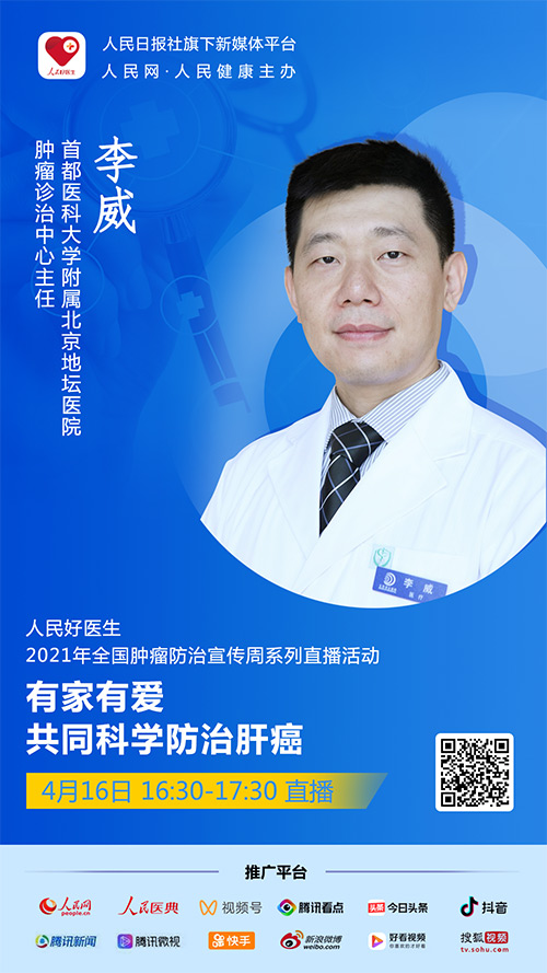 2021年4月16日(周五)16:30-17:30,首都醫(yī)科大學附屬北京地壇醫(yī)院腫瘤診治中心主任李威將做客人民日報社旗下新媒體“人民好醫(yī)生”客戶端,就肝癌預防和救治的相關(guān)話題進行在線分享,歡迎屆時收看。