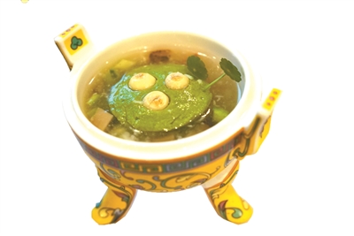 荷塘春月色則以魚肉、蓮子、蛋白、火腿等做出荷塘月色的意境,此菜既突出粵菜“清鮮嫩滑”的特點,更形象顯露出粵菜“優(yōu)雅脫俗”的風格;“荔熟秋蟬鳴”取嶺南佳果元素,何物令得“一騎紅塵妃子笑”?原是荔枝也!粵菜師傅巧妙運用雞胸肉蓉做荔枝來比喻“果”,五花肉切片包卷荔浦芋來比作“蔬”,突出廣東地區(qū)果蔬物產(chǎn)豐富的創(chuàng)作思維;廣東屬沿海地區(qū),蝦本是居民餐桌常見之物,而姜則是粵菜烹飪之引物,“無菜不落姜”已為粵菜師傅的烹調(diào)手法,“金絲伴彩霞”運用多種烹飪法,采用一蝦兩食配以炸姜絲突出粵菜風味。