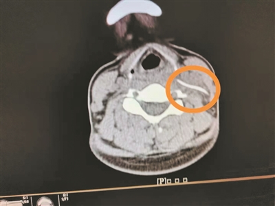 4月1日,陳女士帶女兒到南方醫(yī)科大學(xué)第三附屬醫(yī)院就診,想起自己頸部不舒服,就順便到耳鼻咽喉科就診,副主任醫(yī)師曹慶碩接診后,請患者平躺檢查,此時(shí)陳女士感覺頸部更痛了,醫(yī)生懷疑頸部有異物,于是進(jìn)行了頸部CT平掃,果然發(fā)現(xiàn)左側(cè)頸動脈鞘區(qū)有異物。