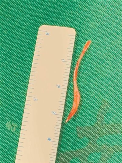 明確診斷后,醫(yī)生為陳女士安排4月2日手術(shù),行“頸部側(cè)切開異物取出術(shù)”,術(shù)中見一魚刺橫行于甲狀軟骨平面的咽旁間隙內(nèi),緊貼頸內(nèi)靜脈、頸總動脈后方,周圍炎性組織包裹,幸好頸部血管無損傷,分離包裹的炎性組織,取出異物,長3.3cm。