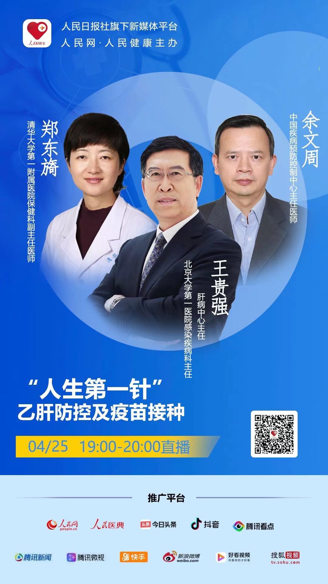 2021年4月25日(周日)19:00-20:00,在第35個(gè)全國兒童預(yù)防接種日來臨之際,人民日報(bào)社旗下新媒體“人民好醫(yī)生“將邀請北京大學(xué)第一醫(yī)院感染疾病科暨肝病中心主任 王貴強(qiáng)、中國疾病預(yù)防控制中心免疫規(guī)劃中心主任醫(yī)師 余文周、清華大學(xué)第一附屬醫(yī)院副主任醫(yī)師 鄭東旖做客演播室,向公眾科普乙肝疾病及疫苗接種相關(guān)知識(shí),幫助廣大新手父母解答兒童接種乙肝疫苗的日常疑問,提高對科學(xué)接種疫苗的重視,保護(hù)兒童健康成長。歡迎大家前來收看提問。