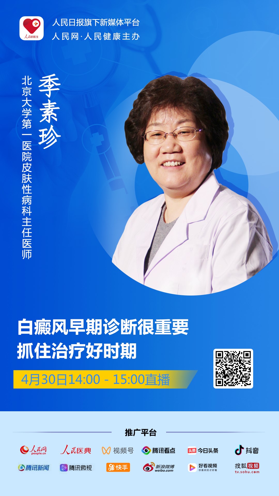 2021年4月30日14:00-15:00,北京大學(xué)第一醫(yī)院皮膚性病科主任醫(yī)師季素珍將做客人民好醫(yī)生名醫(yī)直播欄目,給公眾科普白癜風(fēng)相關(guān)知識。