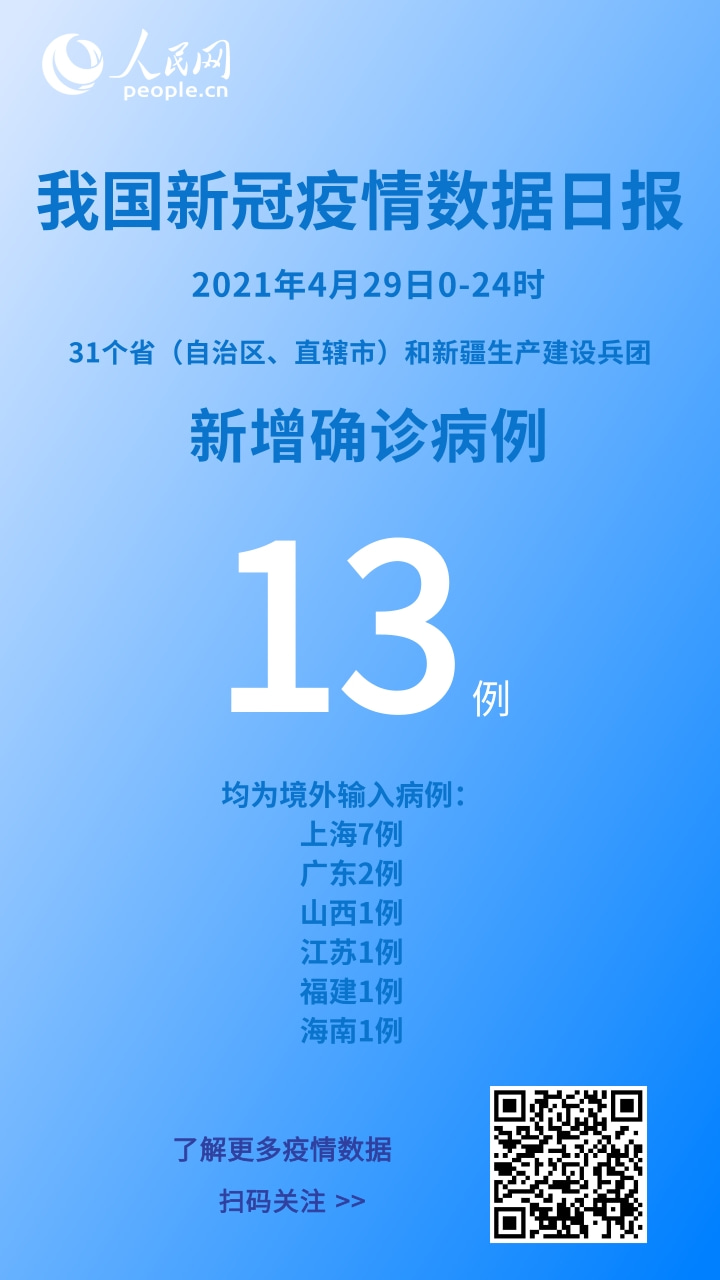 人民網(wǎng)北京4月30日電 (記者崔元苑)今日,國家衛(wèi)生健康委于官網(wǎng)發(fā)布了截至4月29日24時新型冠狀病毒肺炎疫情最新情況。4月29日0—24時,31個。ㄗ灾螀^(qū)、直轄市)和新疆生產(chǎn)建設(shè)兵團(tuán)報告新增確診病例13例,均為境外輸入病例(上海7例,廣東2例,山西1例,江蘇1例,福建1例,海南1例);無新增死亡病例;新增疑似病例3例,均為境外輸入病例(上海2例,內(nèi)蒙古1例)。