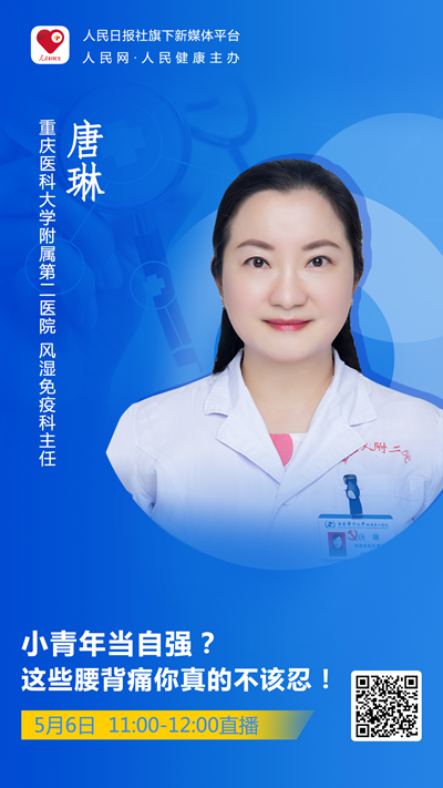 2021年05月06日(周四)11:00-12:00“人民好醫(yī)生”客戶端將邀請(qǐng)重慶醫(yī)科大學(xué)附屬第二醫(yī)院風(fēng)濕免疫科主任唐琳進(jìn)行視頻直播,來和大家一起分享強(qiáng)直性脊柱炎及其診療的相關(guān)知識(shí),千萬不要錯(cuò)過。