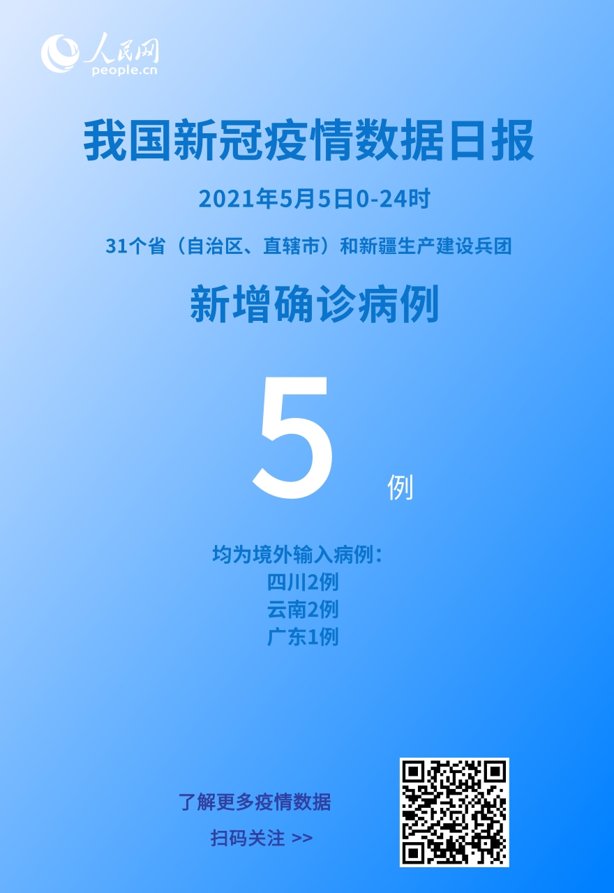 人民網北京5月6日電 (記者崔元苑)今日,國家衛(wèi)生健康委于官網發(fā)布了截至5月5日24時新型冠狀病毒肺炎疫情最新情況。5月5日0—24時,31個。ㄗ灾螀^(qū)、直轄市)和新疆生產建設兵團報告新增確診病例5例,均為境外輸入病例(四川2例,云南2例,廣東1例);無新增死亡病例;新增疑似病例1例,為境外輸入病例(在上海)。
