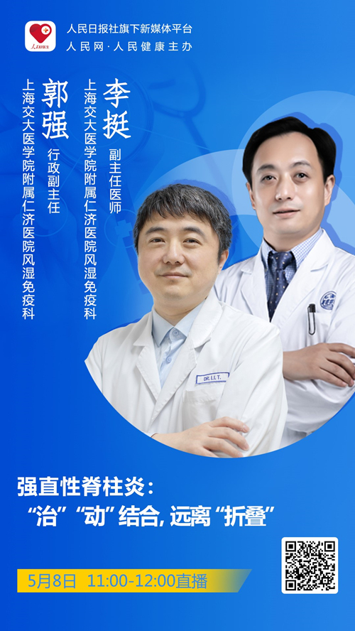 2021年5月8日11:00-12:00,我們將邀請上海交大醫(yī)學(xué)院附屬仁濟醫(yī)院風(fēng)濕免疫科行政副主任郭強、上海交大醫(yī)學(xué)院附屬仁濟醫(yī)院風(fēng)濕免疫科副主任醫(yī)師李挺做客演播室,為大家進(jìn)行強直性脊柱炎系列訪談的第三場直播,探討強直性脊柱炎的規(guī)范治療與運動管理,千萬不要錯過。