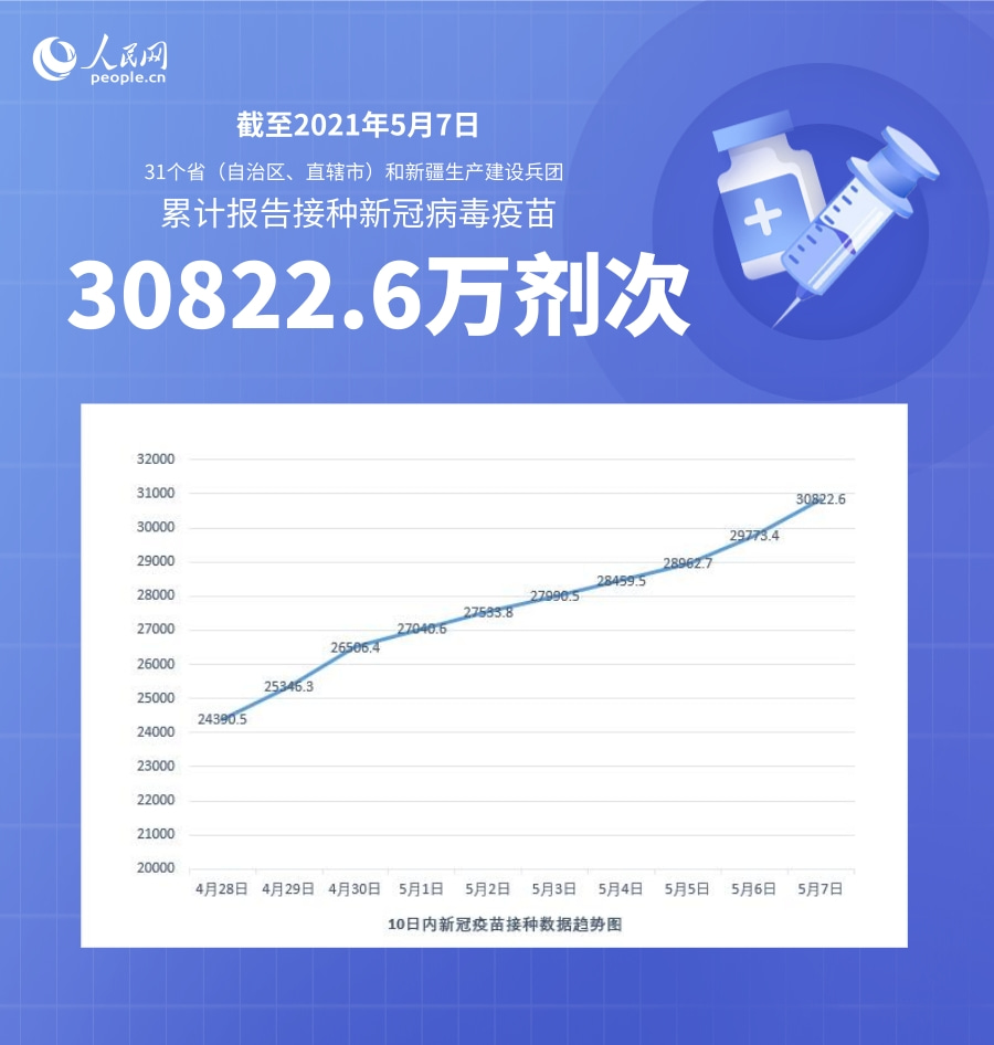 人民網(wǎng)北京5月8日電 (記者崔元苑)據(jù)國家衛(wèi)生健康委官網(wǎng)消息,截至2021年5月7日,31個(gè)。ㄗ灾螀^(qū)、直轄市)和新疆生產(chǎn)建設(shè)兵團(tuán)累計(jì)報(bào)告接種新冠病毒疫苗30822.6萬劑次。