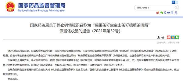 國家藥監(jiān)局:“瑞果茶籽寶寶山茶籽植萃茶清霜”為假冒化妝品 立即停止銷售