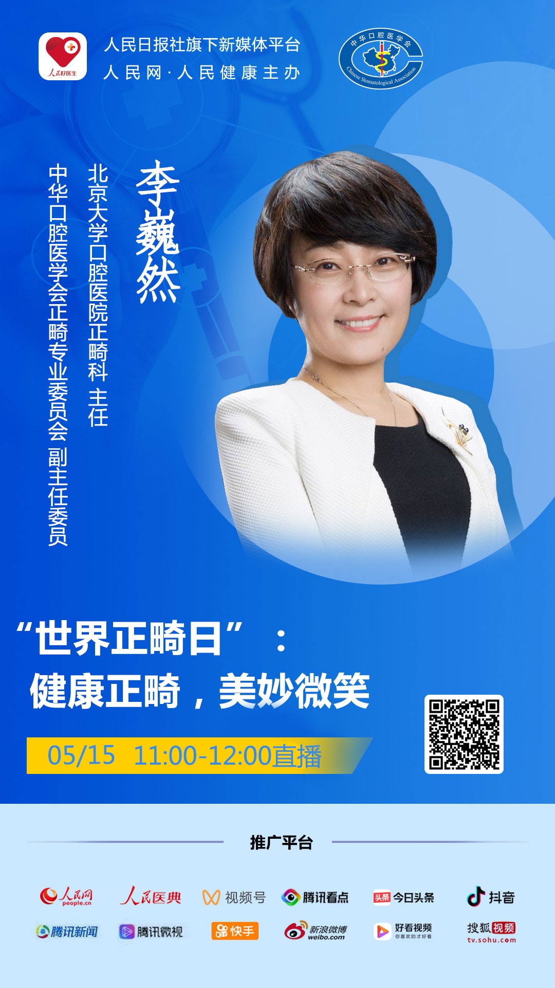 今年5月15日是第五個(gè)“世界正畸日”(World OrthodonticHealth Day)。世界正畸日的設(shè)立,旨在喚起廣大民眾對正畸的認(rèn)識,促進(jìn)廣大正畸醫(yī)師為廣大民眾提供健康的正畸治療。牙齒不完美,想做正畸,但是做正畸會有這種那種顧慮,關(guān)于各種傳言,可信不可信呢?5月15日11:00至12:00我們邀請到北京大學(xué)口腔醫(yī)院正畸科主任李巍然做客人民好醫(yī)生名醫(yī)直播欄目。給公眾科普口腔正畸的相關(guān)知識。