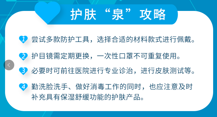 “面部過敏、皮膚損傷和繼發(fā)性損傷是長時間佩戴口罩最常見的三大問題。”王剛在訪談中表示,其中過敏現(xiàn)象因人而異,與外界環(huán)境刺激、皮膚表皮生態(tài)和化學(xué)成分物質(zhì)等均有關(guān),應(yīng)針對膚質(zhì)選擇不同材質(zhì)及款式的口罩或護(hù)目鏡進(jìn)行嘗試,選擇適合自己的產(chǎn)品。如不清楚自己的膚質(zhì)狀況可前往醫(yī)院進(jìn)行過敏源測試。皮膚損傷是更為嚴(yán)重的情況,部分醫(yī)護(hù)人員甚至由于護(hù)目鏡的壓迫引發(fā)皮膚感染,需注意定期更換防護(hù)用具,適時調(diào)整佩戴位置和角度,并注意衛(wèi)生和消毒,避免二次感染;對于常見防疫措施帶來的皮膚繼發(fā)性損傷,比如頻繁清洗面部及手部,造成的皮膚干燥甚至皮炎濕疹等,建議及時采用有針對性的護(hù)膚產(chǎn)品,做好皮膚保濕和養(yǎng)護(hù)。