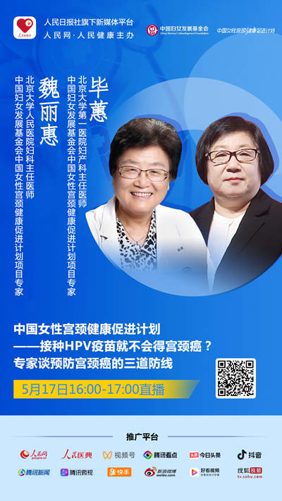 5月17日(星期一)16:00至17:00,中國婦女發(fā)展基金會中國女性宮頸健康促進計劃項目專家、北京大學人民醫(yī)院婦科主任醫(yī)師魏麗惠,中國婦女發(fā)展基金會中國女性宮頸健康促進計劃項目專家、北京大學第一醫(yī)院婦產(chǎn)科主任醫(yī)師畢蕙將做客演播室,為大眾普及宮頸癌預(yù)防相關(guān)科普知識,千萬不要錯過。