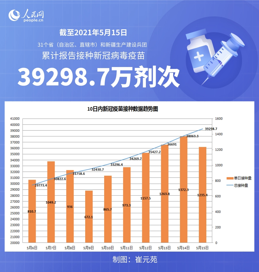 人民網(wǎng)北京5月16日電 (記者崔元苑)據(jù)國家衛(wèi)生健康委官網(wǎng)消息,截至2021年5月15日,31個(gè)。ㄗ灾螀^(qū)、直轄市)及新疆生產(chǎn)建設(shè)兵團(tuán)累計(jì)報(bào)告接種新冠病毒疫苗39298.7萬劑次。15日單日接種新冠病毒疫苗1235.4萬劑次。