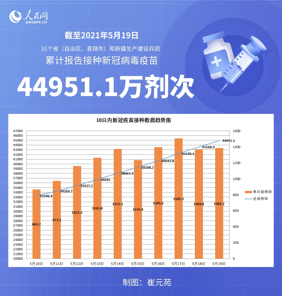 人民網(wǎng)北京5月20日電 (記者崔元苑)據(jù)國家衛(wèi)生健康委官網(wǎng)消息,截至2021年5月19日,31個省(自治區(qū)、直轄市)和新疆生產建設兵團累計報告接種新冠病毒疫苗44951.1萬劑次。19日單日接種新冠病毒疫苗1382.2萬劑次。