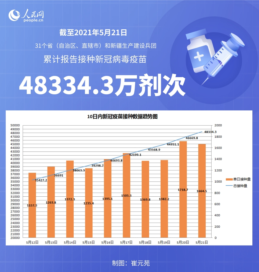 人民網(wǎng)北京5月22日電 (記者崔元苑)據(jù)國家衛(wèi)生健康委官網(wǎng)消息,截至2021年5月21日,31個(gè)省(自治區(qū)、直轄市)和新疆生產(chǎn)建設(shè)兵團(tuán)累計(jì)報(bào)告接種新冠病毒疫苗48334.3萬劑次。21日單日接種新冠病毒疫苗1664.5萬劑次。