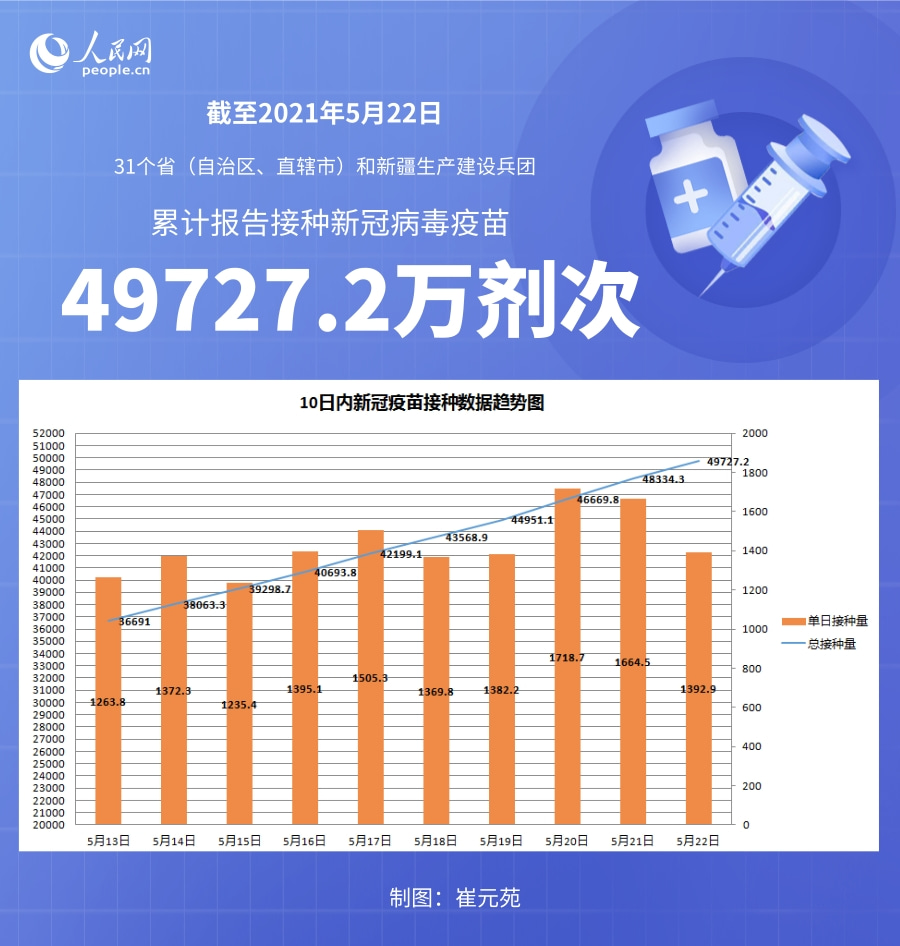 人民網(wǎng)北京5月23日電 (記者崔元苑)據(jù)國(guó)家衛(wèi)生健康委官網(wǎng)消息,截至2021年5月22日,31個(gè)省(自治區(qū)、直轄市)和新疆生產(chǎn)建設(shè)兵團(tuán)累計(jì)報(bào)告接種新冠病毒疫苗49727.2萬(wàn)劑次。22日單日接種新冠病毒疫苗1392.9萬(wàn)劑次。