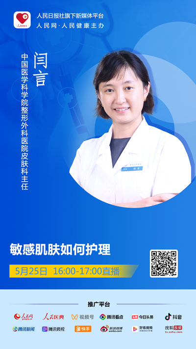 5月25日(周二)16:00-17:00,“人民好醫(yī)生”客戶端將邀請中國醫(yī)學科學院整形外科醫(yī)院皮膚科主任閆言進行視頻直播,解答科普敏感肌膚日常管理的相關(guān)問題,千萬不要錯過。